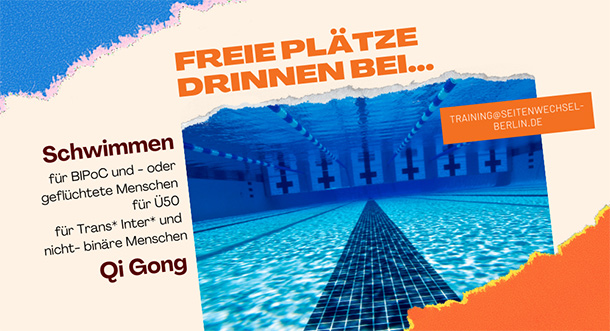 Klassisch in der Halle, aber in den Sommerferien dann auch im Prinzenbad, haben wir noch freie Plätze beim Ü50 Schwimmen am Dienstag, beim Schwimmen für BiPOC und geflüchtete Menschen am Freitag und in der Schwimmgruppe am Freitag 20 Uhr, die noch für TIN Personen offen ist.